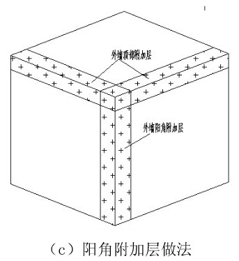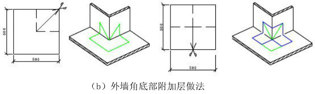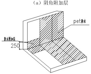 9、防水卷材密封收頭:卷材收口用金屬壓條和鋼釘固定,再用密封膏密封。卷材收口應(yīng)高出室外地坪500 mm。 (三)各節(jié)點(diǎn)做法 1、陰陽角附加層做法如下,附加層總寬度為500mm,每側(cè)250mm。